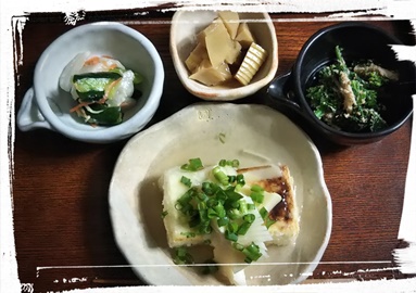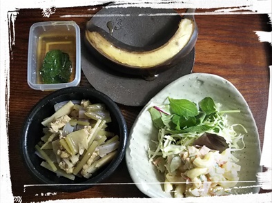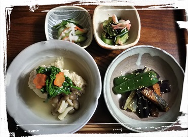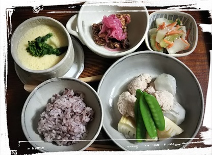 夜)つくね団子とサトイモとタケノコ煮/いかの竜田揚げマリネ/漬物/茶碗蒸し ※茶碗蒸しは、時々食べたくなるものの一つです。 ※漬物は、カブとキュウリと人参を塩麹とらっきょう酢で漬けました。 |