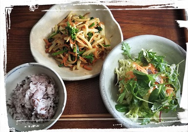 夜)タケノコご飯/春雨サラダ/筍と油揚げとこんにゃく煮/ゴボウと蒸し鶏のサラダ ※ゴボウと蒸し鶏のサラダには、「ごまおから」をたっぷりと入れいます。 ※筍と油揚げとこんにゃく煮は、 崎陽軒の焼売弁当に入っている筍煮を真似てみました。 |