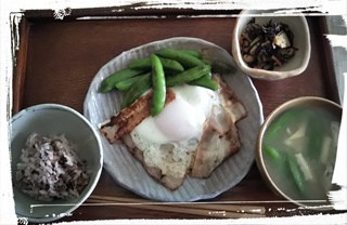 朝)ベーコンエッグ/スナップエンドウソテイ/ひじき煮/ スナップエンドウと油揚げの味噌汁 ※畑で収穫したスナップエンドウをたっぷりと美味しく頂きました 甘くて歯ごたえがあって、本当い美味しいですヽ(^。^)ノ |