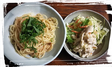 夜)たらこパスタ/チキンサラダ ※市販のたらこソースを買ってみたら、意外と美味しかったのです(^^♪ 2食分いりだったので、4/29に引き続き、残りの1食を頂きました。 今回は、大葉をたっぷり乗せてみました。 |