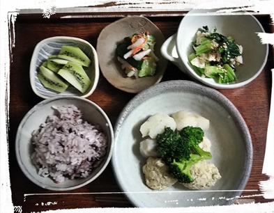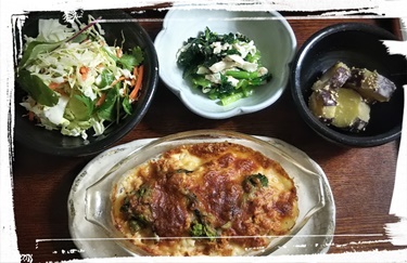 夜)野菜ミートグラタン/グリーンサラダ/小松菜と蒸し鶏の胡麻和え/サツマイモのナッツサラダ ※時間のある時に作って、小分け冷凍していたミートソースを使い、 ジャガイモのスライス、ブロッコリー、カリフラワーを牛乳で煮て、 グラタンの具に ※サツマイモは、セイロで蒸して、生協のナッツドレッシング出会えただけ(^^♪ |