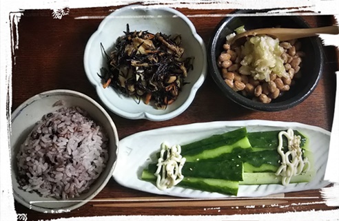 夜)ひじき煮/春雨サラダ/タケノコこんにゃく煮/漬物 ※冷蔵庫にある常備菜のみの晩ご飯です。 こういう晩ご飯は毎日でもOKです(^^♪ |