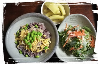 昼)筍ご飯/漬物/茹でスナップエンドウ ※夏のようなお日様が照り注ぎ、さっぱりとしたお昼ご飯に(^^♪ |