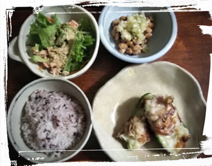 夜)納豆/きゅうり/ひじき煮 ※急に、キュウリのマヨネーズがけが食べたくなりました。 今日が夏のように扱ったからでしょうか。 うまし。 ※納豆には、長ネギを細切りにして、ごま油とゴマを和えた薬味をたっぷりと・・・ |