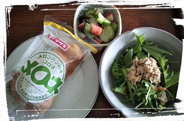 昼)コロネパン/ツナサラダ/酢の物 ※畑仕事から帰宅し、シャワーを浴びて、洗濯物を洗って・・・ 午後の在宅勤務(13:15〜)の為、サラダ、酢物もは、朝、作って置き、 畑の帰りに生協で買い物した際に、コロネパンを買ってきましたヽ(^。^)ノ |