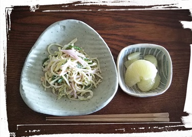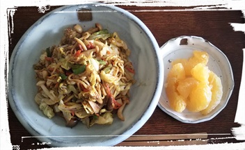 昼)野菜焼きそば/甘夏 ※麺よりも、野菜の方が多い焼きそば キャベツ、キノコ、ピーマン、人参・・・ ※宅配生協さんのキノコセットはお安くて美味しくて、色々と楽しめます♪ |