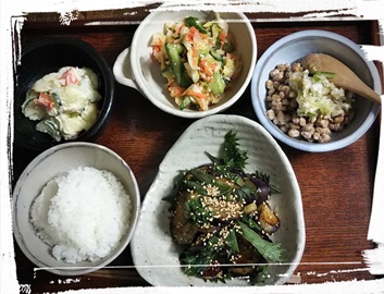 夜)茄子の生姜焼き大葉和え/ポテトサラダ/納豆/漬物サラダ ※今、「マイ・ブーム」の生姜タレを使って、ナスを焼き、火を止めた後に、 仕上げに、たっぷりの大葉をちぎって、茄子にあえると、絶妙な美味しさヽ(^。^)ノ ※珍しく白米(笑) ※納豆には、長ネギをごま油とゴマで和えた薬味をたっぷりと・・・ ※漬物は塩こうじを使って、サラダ感覚で(^o^) キャベツ、キュウリ、人参のみ ショウガとらっきょう酢もいれて(^_-)-☆ |