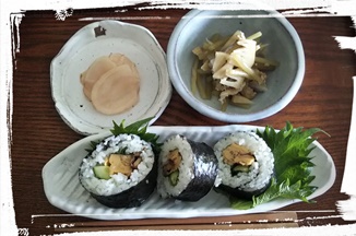 昼)太巻き/紅ショウガ/フキとタケノコと油揚げの煮物 ※太巻きは、厚焼き玉子・キュウリ・干し椎茸煮・大葉という野菜ばかり。 ※紅ショウガも新生姜で作りました。 すし飯には、やはり、紅ショウガですね(^_-)-☆ |