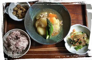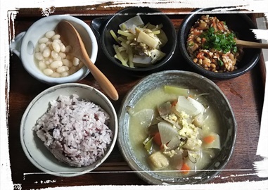夜)けんちん汁/納豆こうじ/手亡豆煮/フキとタケノコと油揚げの煮物 ※手亡豆は、一晩起きて、味がしみ込んで、美味しくなりました。 この甘さに癒されて一日が終わる幸せ・・・(^^)v ※納豆こうじの上野万能ねぎは、ベランダ菜園のものです。 あっという間に成長して、食卓を楽しませてくれます。 ※またまた、フキの煮物・・・ 毎食食べても飽きません(笑) ※今日は、ちょっぴり寒かったので、けんちん汁を作りました。 お味噌は、昨年2月に仕込んだもの。 そろそろなくなります。 今年は、コロナウィルスの関係で、少々、送れて4月の中旬に仕込みました。 出来上がりが楽しみですヽ(^。^)ノ |