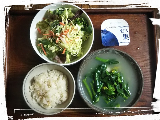 夜)サラダ/筍ご飯(冷凍)/菜花のお雑煮(お餅2個) キャベツ、人参、ベリーリーフのサラダは、常に冷蔵庫にあります。 お餅は、お正月の残りです。 珍しく白米です。 |