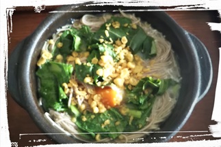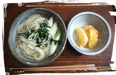 昼)小松菜卵入りそば 今日も暖かいものでお昼ご飯を。 小松菜をたっぷり入れて、天かすもいれました。 身体が温まります。 |