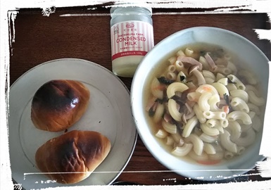 昼)マカロニスープ/ロールパン ※ロールパンは、ちょっと目を離したすきに トースターの中でこんがり・・・(笑)(^^ゞ ※お友達から頂いた「北海道 町村農場」の コンデンスミルクをつけて。 贅沢な朝ごはんですね〜〜〜ヽ(^。^)ノ |