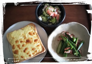 昼)チーズトースト/アスパラガスとベーコンソティ/食い入りt噓つき酢の物 ※無性に、チーズトーストが食べたくなりました。 ※アスパラガスは、ベーコンとの相性が抜群ですね(^_-)-☆ ※酢のものも食べたくなり、キュウリとうそガニの定番(笑) |