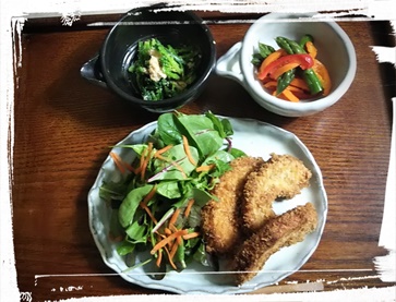 夜)肉じゃが/ゴボウのカリカリ揚げ/キャベツの胡麻和え ※昨日、収穫したての新玉ねぎで、肉じゃがに。 新玉ねぎの甘さは、抜群ですね! ※ゴボウのカリカリ揚げは、コロコロにカットしたゴボウを 片栗粉を付けて、焼き上げにして、 みりん、しょうゆ、らっきょう酢のたれに漬けたもの。 娘からのレシピなのですが、 孫の一人は「ポコポコして大好物!」と言っているとかヽ(^。^)ノ |