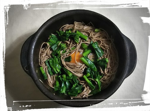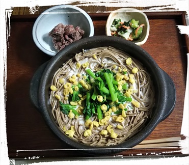 昼)卵と菜花入りそば 在宅勤務となり、お昼休みは1時間。 暖かいものを食べたくて、土鍋のままふ〜〜ふ〜と頂きました |