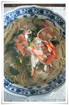 昼)スープパスタ(朝の主人の野菜コンソメスープの残りを利用) 葉大根の小さな大根、ニンジン、玉ねぎ、小松菜の菜花、ベーコンなど 色んなものを入れてみました。 |