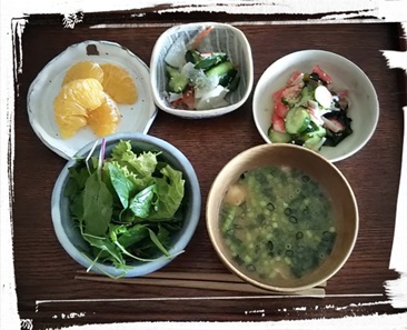 夜)かき菜と豆腐入り蕎麦/メンマ/キュウリとわかめとうそガニ酢の物/甘夏 ※甘夏は、直売所で2個100円です。 甘くない甘夏です(笑) でも、みずみずしくて美味しいです。 時間はたっぷりあるので、夜、TVを見ながら、剥いて、タッパにいれて、 甜菜糖を振りかけて冷蔵庫へ。 冷たくてほんのり甘い果物は、パワーアップします。 |
