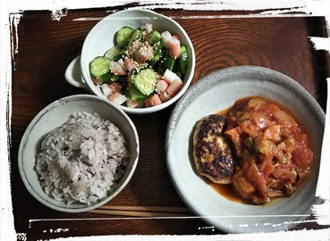 夜)ハンバーグ入りラタティユ/キュウリとうそガニ酢の物 ※とりたての新玉ねぎと人参をいただきました。 どうしても、「ラタティユが食べたいぃ!!」という思いが強く、 生で食べずに、あえて、ラタティユに(笑) |