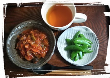 朝)ラタティユ/茹でスナップインゲン ※畑でもぎたてのスナップエンドウは、さっと茹でただけでお美味しいですね。 |