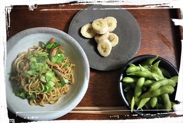 夜)焼きそば/枝豆/冷凍バナナ ※ソース味が食べたくなりました。 冷凍庫の底に隠れていた封を開けてあった枝豆と、 いざという時用のデザートの冷凍バナナを。 これ、本当に美味しいですヽ(^。^)ノ |