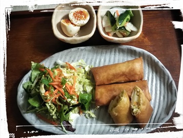 夜)春巻き/サラダ/漬物/酢卵 ※先日、娘がLINEで春巻きの写真をUP それを見て、無性に食べたくなり、一人ごはんを満喫♪ 筍、人参、キャベツをたっぷり。 今回は、冷蔵庫にちょっと残っていた 簡単鶏ハム を入れたら、 とても美味しかったですヽ(^。^)ノ |