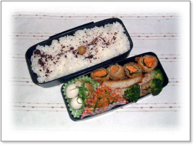 ささみの野菜巻き(人参・キャベツ) ブロッコリーの豚肉巻き焼き ちくわの磯辺上げ 厚焼き玉子(パセリ入り) がんも煮(ほうれん草添え) カリカリ梅ご飯 |