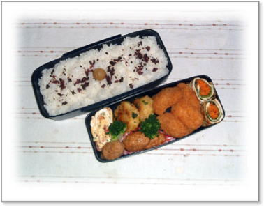 | ささみフライ かまぼこチーズ挟み海苔巻き焼き ポテトフライ がんも煮(ほうれん草添え) 厚焼き玉子(パセリ入り) ウィンナーブロッコリーソティ カリカリ梅ご飯 |