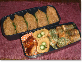 豚肉厚揚げ大葉巻き ちくわの磯辺揚げ 厚焼き玉子(アスパラ入り) ハンバーグ お稲荷さん |