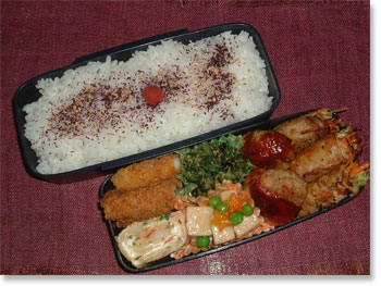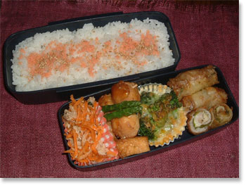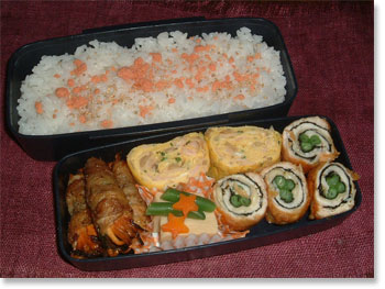 | 豚肉厚揚げ野菜巻き アスパラのベーコン巻 ホウレンソウとコーンソティ 厚焼き玉子(パセリ入り) ささみと大葉とチーズの春巻き カリカリ梅ご飯 |