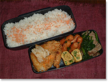 ジャガイモ入り肉団子 かまぼこの大葉挟み焼き ソーセージとズッキーニの挟み焼き 油揚げの落とし卵煮 チキン(生協冷凍品) 鮭ごまごはん |