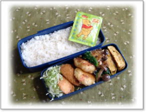| ササミチーズかつ ポテトハンバーグ 厚揚げ・シメジ・ほうれん草炒め 厚焼きたまご ご飯&ぷーさんふりかけ(やさい) |