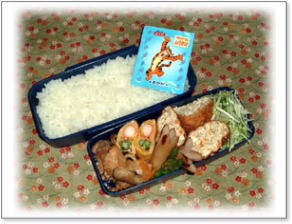 | 豆腐コロッケ(キャベツ敷き) ウィンナー(たこ)ほうれん草ソティ うそかにかまぼこ&いんげん入り厚焼き玉子 肉じゃが ご飯&ぷーさんふりかけ(たまご) |