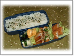 イカフライ 厚揚げチーズ、大葉豚肉巻き焼き 厚焼き玉子 ウィンナー(たこ) かまぼこのシソ挟み海苔巻き ごまわかめご飯 |