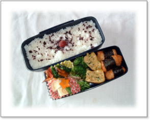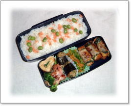 豚肉厚揚げまき(チーズ・大葉) 厚焼き玉子(ほうれん草入り) 金平ハンバーグの海苔巻き甘辛煮 カップラザニア(ワンタン皮・ミート・ホワイトソース)) 三色ご飯(ブロッコリー・豚ひき肉そぼろ・卵) |