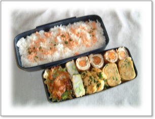 | 厚揚げの豚肉まき(大葉・チーズ) キャベツと人参の金平 キャベツと筍ハンバーグの海苔巻き 厚焼き卵(小松菜入り) ベーコンの野菜巻き(エリンギ、ブロッコリー) 鮭フレークと枝豆ご飯 |