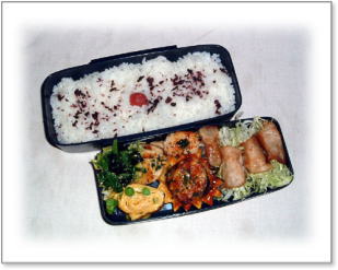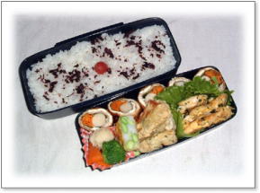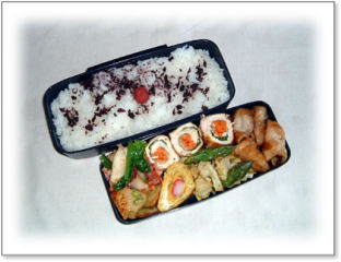 エビフリッター(シュガーレディ) 豚肉野菜巻き(アスパラガス・エリンギ) 鶏から上げ海苔巻き 厚焼き玉子(グリーンピース入り) ほうれん草の胡麻和え カリカリ梅ご飯 |