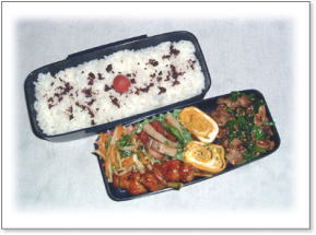 ソーセージ焼(パセリ) 厚焼き玉子(グリーンピース入り) ジャガイモとアスパラガスのソテイ はすの枝豆入りはさみ揚げ 煮物(人参・筍・こんにゃく・いんげん) 焼そば(豚肉・キャベツ・人参・青海苔) |
