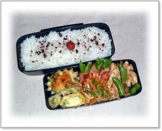 鶏肉とスナップエンドウのソティ ベーコン野菜巻き(インゲン) カブの皮と人参とインゲンのきんぴら ブロッコリーのカップホワイトソースグラタン 厚焼き玉子(インゲン入り) ちくわの磯辺上げ カリカリ梅ご飯 |
