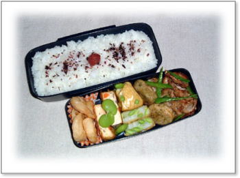 豚肉のしょうが焼き(キャベツ添え) 豚肉油揚げ野菜巻き(スナップエンドウ・人参) 厚揚げの豚肉巻き(大葉・チーズ入り) 厚焼き玉子(パセリ入り) がんもとインゲン煮 カリカリ梅ご飯 |