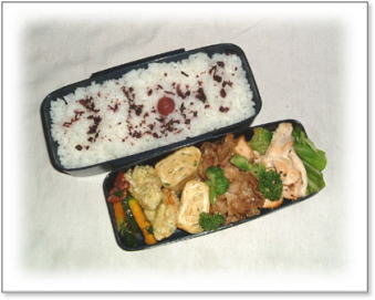 焼き肉(ほうれん草シメジソティ添え) 厚焼き玉子(パセリ入り) ささみの野菜巻き(人参・キャベツ) 荒野豆腐煮 人参とキャベツの金平 カリカリ梅ご飯 |