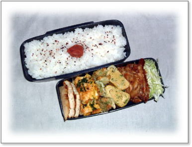豚肉のしょうが焼き(キャベツ添え) 肉団子とうずらの串刺し 油揚げの野菜巻き(人参・いんげん・キャベツ入り) 厚焼き玉子(パセリ入り) 金平(人参・ごぼう) カップミートグラタン カリカリ梅と枝豆ご飯 |