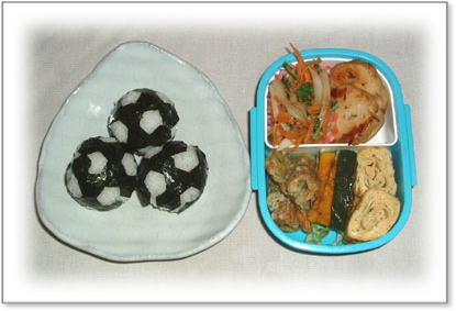 厚焼き玉子 かぼちゃのソティ 金平(はす・人参・ブロッコリー) ちくわの磯部揚げ) ジャガイモ焼き サッカーお結びご飯 *この日は、娘のお弁当 |