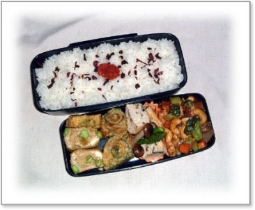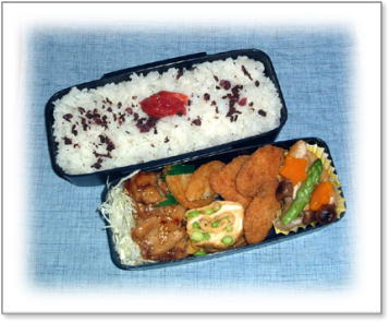 鶏肉のカシューナッツ炒め がんも煮(いアスパラ・シメジ) 厚焼き玉子(枝豆入り) ちくわの磯辺揚げ カリカリ梅ご飯 |