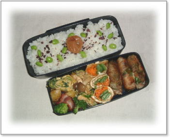 厚揚げの豚肉まき(大葉・チーズ) 油揚げの野菜入り網焼き(さやインゲン・人参いり) 厚焼き玉子(ほうれん草入り ベーコン・ブロッコリー・ジャガイモのソティ ゆかり 枝豆 梅干ご飯 |