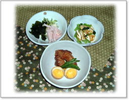 | 鶏肉と卵のマーマレード煮 豆腐サラダ(若布・ハム・きゅうり) 小松菜と焼き油揚げのポン酢がけ 玄米 |