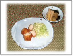 | 筍フライ(キャベツ添え) 筍と大根煮 玄米 |