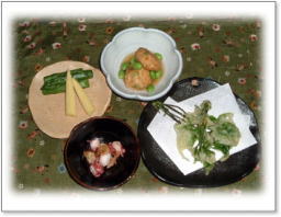 | こしあぶらの天ぷら 枝豆の飛竜頭煮 アスパラとヤングコーンのサラダ たこのニンニク焼き 玄米 |