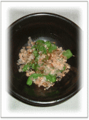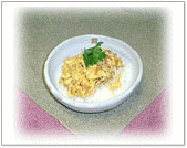 ブイヨンと味噌、醤油、砂糖の 味付けのマーボ豆腐 ベランダで栽培した バジルを添えて・・・ 良く炒めたたまねぎに なめたけ瓶をいれ、 卵でとじてご飯に・・・ |