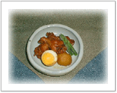 にんにくで炒めた手羽肉を 醤油・マーマレードで煮る ジャガイモ、ゆで卵も一緒に煮る アスパラなどを添える |