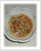 小麦粉を付けたホタテ貝柱を揚げ、 マリネ液(人参・たまねぎ・オクラ)に 漬けよく冷やす さっと茹でた水菜と 人参、干ししいたけ、白滝の白和え |